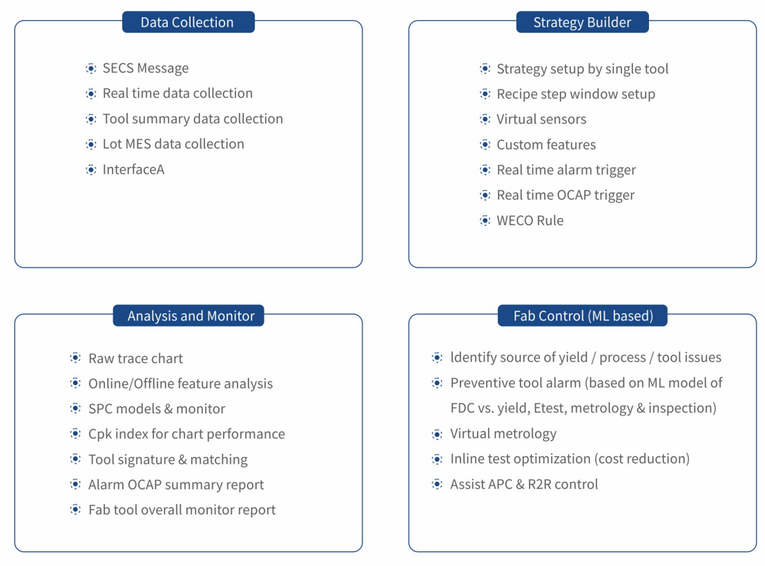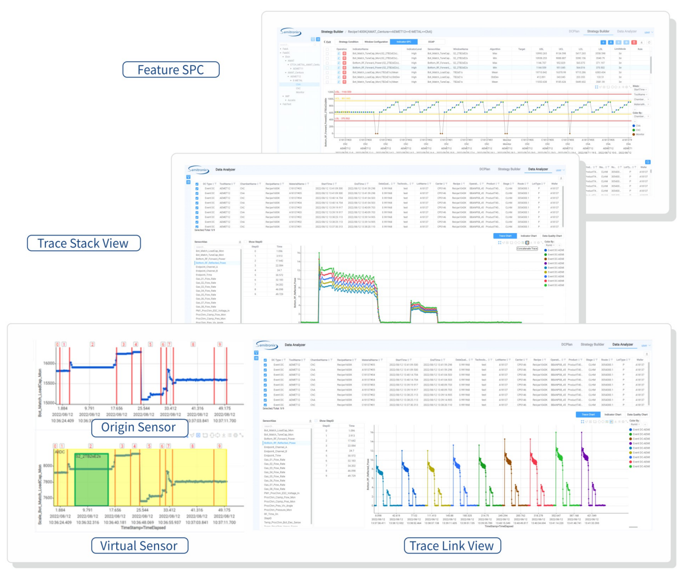 在制造过程中,设备效率和稳定性及工艺的一致性是确保高产品质量和产量的重要因素。55世纪微DataExp-FDC(简称DE-FDC)系统与设备及MES建立通讯,收集设备中传感器的 Raw Trace数据,并从中提取有效表征因子,监控整个生产过程中的设备运行,提供预警和实时调优,保证生产工艺的稳定性。同时FDC收集的大量设备数据和良率分析系统 (YMS)结合,通过大数据机器学习可以帮助快速找到良率问题的根因,并反馈到产线及时修正。除此之外,与Inine量测建立的有效模型,使Fab可及时调整采样策略,减少CycleTime和优化测量设备使用,在保证监控灵敏度的同时降低成本。