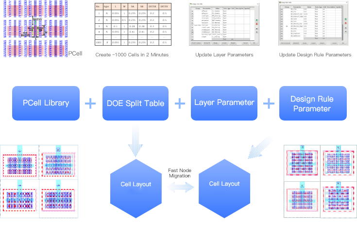 SmtCell是一款参数化单元(Parameterized Cell)版图设计工具。参数化单元的优势在于:相同结构的单元版图只需创建一次;版图中几何图形的相关属性可用参数来表征;单元版图重复、费时的物理设计过程用参数赋值来代替。跟传统的版图设计工具相比,SmtCell可以带来设计效率的大幅提升。